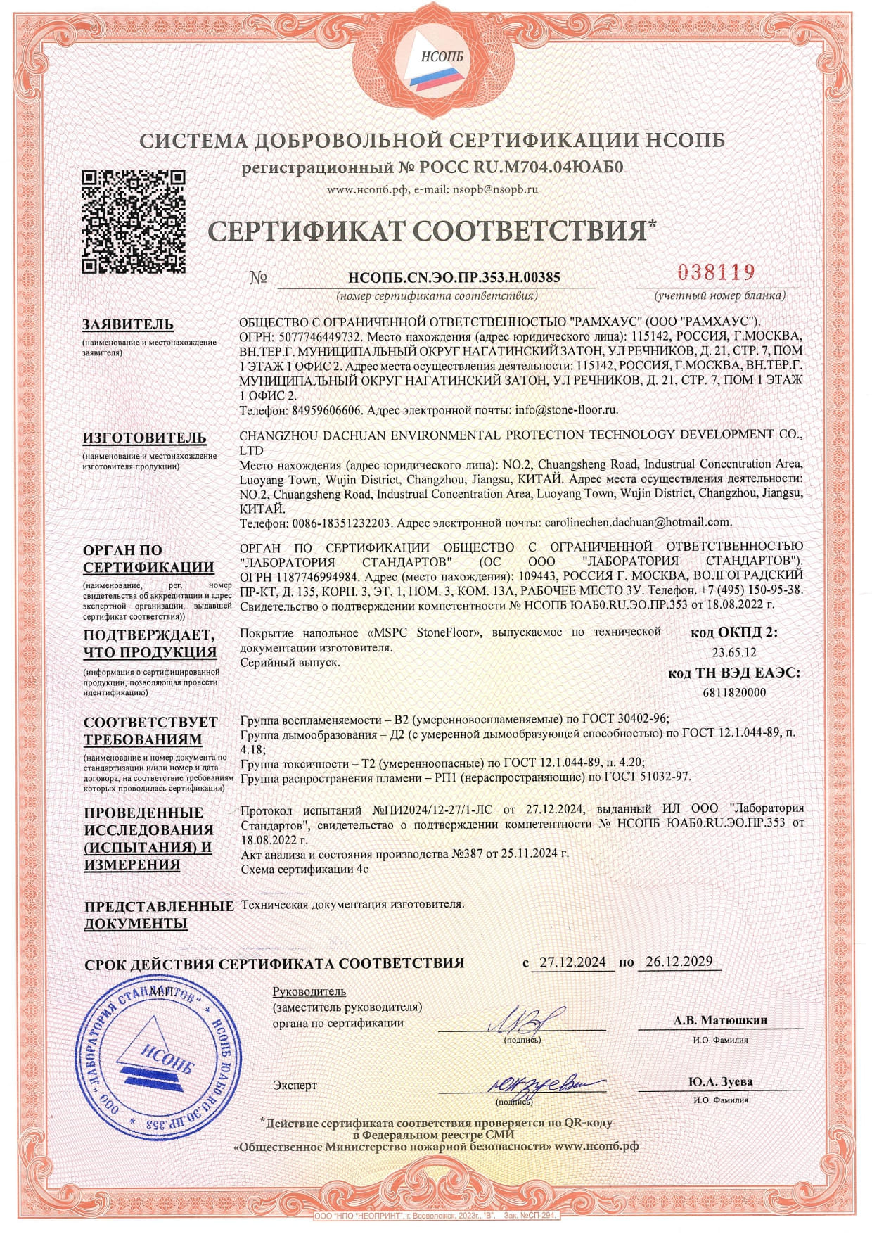 Ниже вы найдете протоколы испытаний MSPC продукции Stone Floor в ПДФ формате, а также добровольный сертификат с синей печатью организации, которая провела реальные испытания.